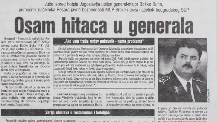 Bio je 10. srpnja 2002. oko dva sata iza ponoći, kada je hicima iz automatske puške, iz zasjede, izrešetan tadašnji načelnik srpske policije, general major Boško Buha, piše Nova.rs. Napad se dogodio na parkingu srušenog hotela „Jugoslavija“, kada je policijski general ulazio u vozilo "nissan patrol“. On se sa prijateljima i djevojkama vraćao sa splava, kad su iz mraka odjeknuli hici. Napadač je čekao trenutak kada je Buha ulazio u automobil, pucano je izbliza. Buha je teško ranjen, pogođen je s više hitaca u prsa, ali je, verovatno zbog krupne građe još bio živ kada su došli prvi policajci, piše Nova. Ostala je upamćena scena kada policajac drži za ruku teško ranjenog Buhu, dok pritrčava ekipa Hitne pomoći. Šef policije je još davao znake života kad je prebačen u Urgentni centar, ali je tamo podlegao ozljedama oko 4 ujutro.
