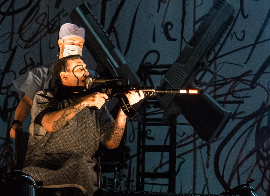 Marilyn Manson uperi pušku u gomilu dok ga guraju u invalidskim kolicima dok nastupa na Knotfestu u regionalnom amfiteatru Glen Helen u San Bernardinu, CA Profimedia
