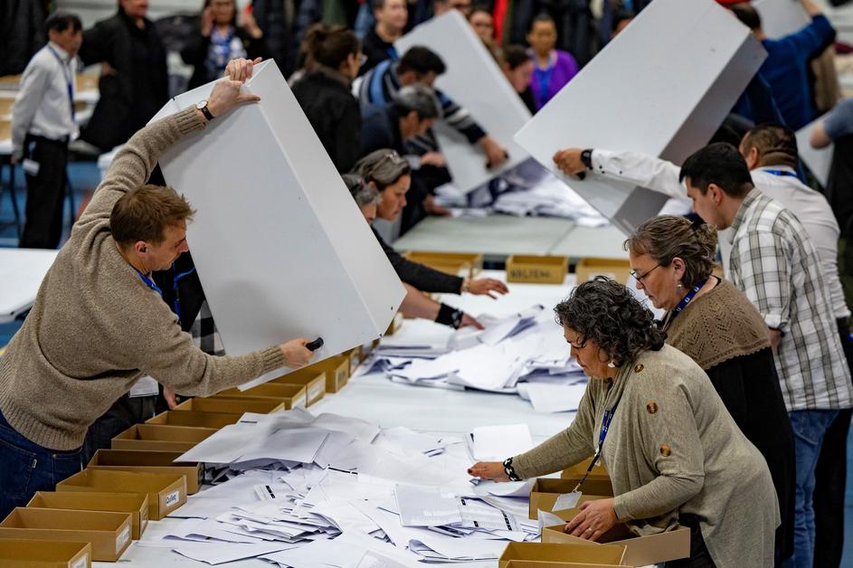 Election workers empty ballot boxes to start counting the votes after the polls closed in Nuuk, Greenland, on March 11, 2025, on the day of the autonomous Danish territory's legislative elections. Greenland voted on Tuesday in legislative elections that could yield a timeline for independence for the Danish self-governing territory coveted by US President Donald Trump.,Image: 974782249, License: Rights-managed, Restrictions: , Model Release: no