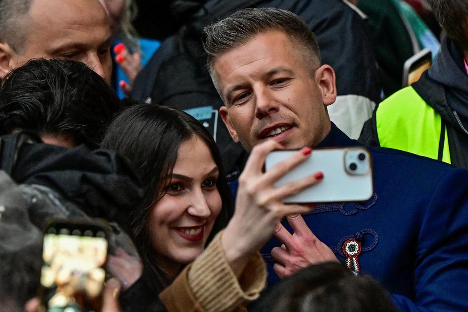 Peter Magyar, leader of Hungarian opposition TISZA party, takes a selfie with a supporter at the demonstration, during Hungary's National Day celebrations, which also commemorate the 1848 Hungarian Revolution against the Habsburg monarchy, in Budapest, Hungary, March 15, 2025. REUTERS/Marton Monus Photo: MARTON MONUS/REUTERS