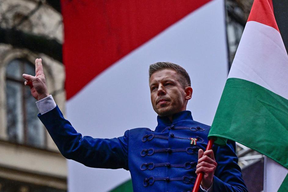 Peter Magyar, leader of Hungarian opposition TISZA party, holds a national flag at the demonstration, during Hungary's National Day celebrations, which also commemorate the 1848 Hungarian Revolution against the Habsburg monarchy, in Budapest, Hungary, March 15, 2025. REUTERS/Marton Monus Photo: MARTON MONUS/REUTERS
