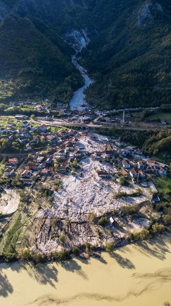 Pogled iz zraka na mjesto Donje Jablanica i kamenolom iz kojeg je krenula lavina kamenja zajedno s bujicom