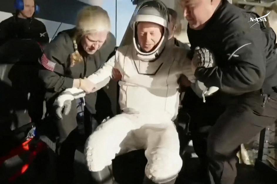 Roscosmos cosmonaut Aleksandr Gorbunov is helped out of a SpaceX Dragon spacecraft onboard the SpaceX recovery ship MEGAN after he, NASA astronauts Nick Hague, Suni Williams, and Butch Wilmore, landed in the water off the coast of Tallahassee, Florida, Tuesday, March 18, 2025. NASA/Keegan Barber/ Handout via REUTERS