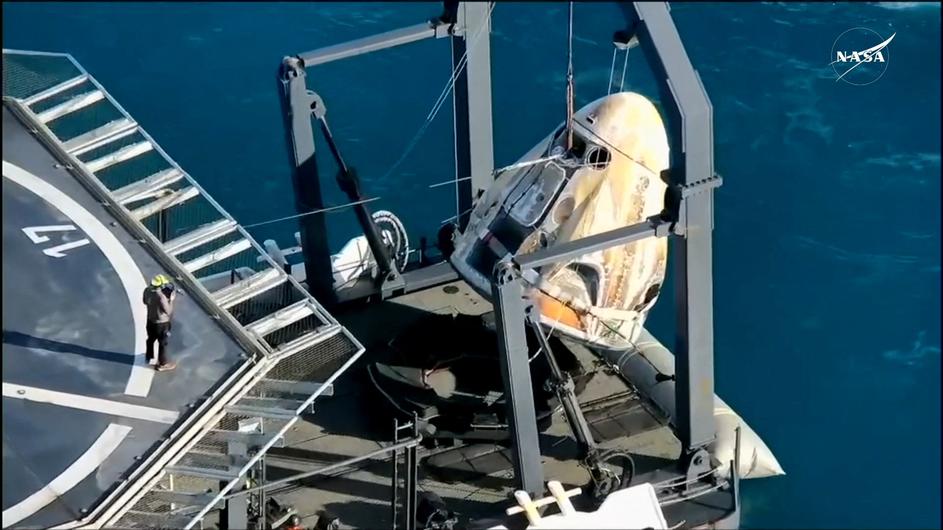 The Crew Dragon capsule containing Butch Wilmore and Suni Williams and two other astronauts is hoisted onto a recovery ship after their splashdown, following their return to earth from the International Space Station off the coast of Florida, U.S. March 18, 2025 in a still image from video. NASA TV/Handout via REUTERS. THIS IMAGE HAS BEEN SUPPLIED BY A THIRD PARTY