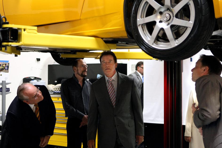 SAN CARLOS, CA - JUNE 30: (L-R) California State Treasurer Bill Lockyer, Tesla Motors President and CEO Ze'ev Drori, California governor Arnold Schwarzenegger, and Tesla Motors Product Arcitect and Engineer Elon Musk look at the underbelly of a Tesla Roadster before a news conference June 30, 2008 at Tesla Motors in San Carlos, California. Governor Schwarzenegger announced that electric car company Tesla Motors will build a new manufacturing facility in California to manufacture its all-electric Tesla Roadster. The $109,000 2009 Tesla Roadster is capable of traveling nearly 250 miles on a single charge and is capable of going 0-60 miles per hour in 3.9 seconds.,Image: 58410351, License: Rights-managed, Restrictions: , Model Release: no