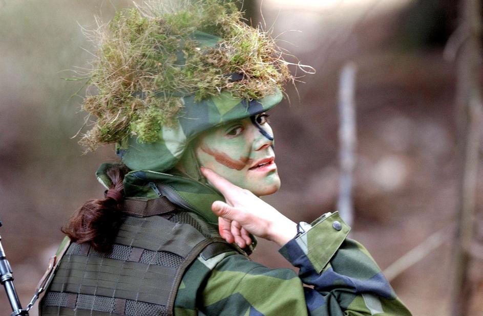 A photo taken March 18 2003 shows Swedish Crown Princess Victoria with camouflage paint in her face during a medical evacuation practise at the Swedish International center outside Stockholm. The Crown Princess took part in a three weeks basic training course for non military personal that makes her able to do overseas service in peacekeeping/enforcing operations with Swedish forces.,Image: 69632004, License: Rights-managed, Restrictions: , Model Release: no