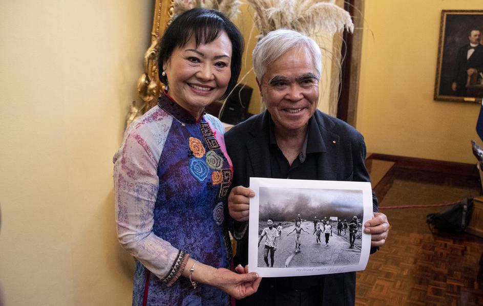 Vietnam War survivor Kim Phuc Phan Thi (L), also known as the "Napalm Girl," poses with photojournalist Nick Ut holding his 1972 Pulitzer Prize and World Press Photo award-winning photograph during the presentation of the Spanish edition of her book at the Ministry of Foreign Affairs and Worship in San José on April 12, 2023. Kim Phuc Phan Thi presented the first Spanish edition of her book Fire Road this Wednesday in Costa Rica, whose prologue was written by Costa Rican Foreign Minister Arnoldo André Tinoco.,Image: 768972004, License: Rights-managed, Restrictions: , Model Release: no