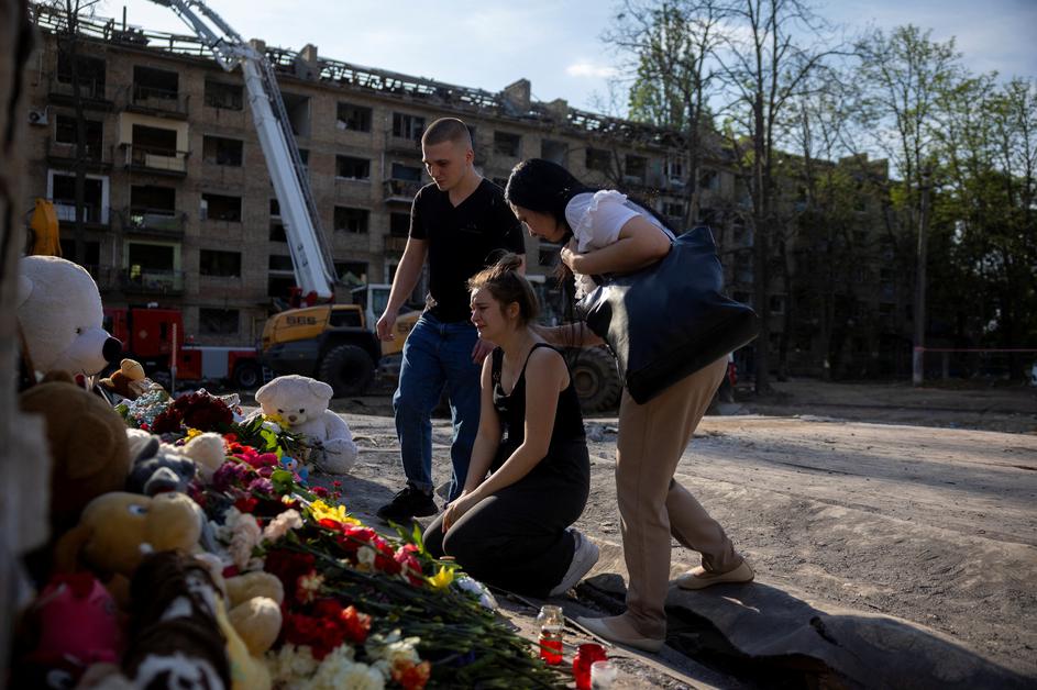 People commemorate a friend who was killed by a Russian missile strike on a residential area, amid Russia's attack on Ukraine, in Kyiv, Ukraine, April 25, 2025. REUTERS/Thomas Peter