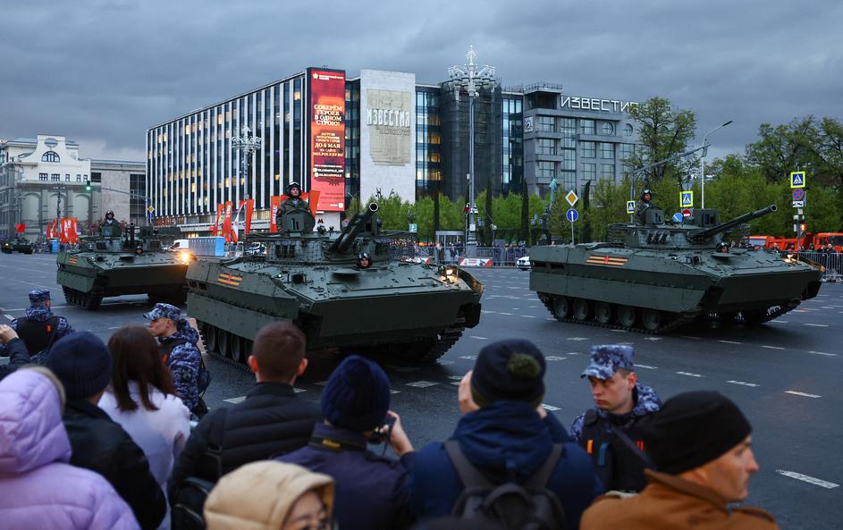 People gather on the roadside to look at Russian armoured vehicles on the day of a rehearsal for a military parade, which marks the 80th anniversary of the victory over Nazi Germany in World War Two, in central Moscow, Russia, April 29, 2025. REUTERS/Evgenia Novozhenina