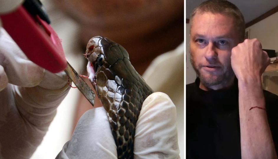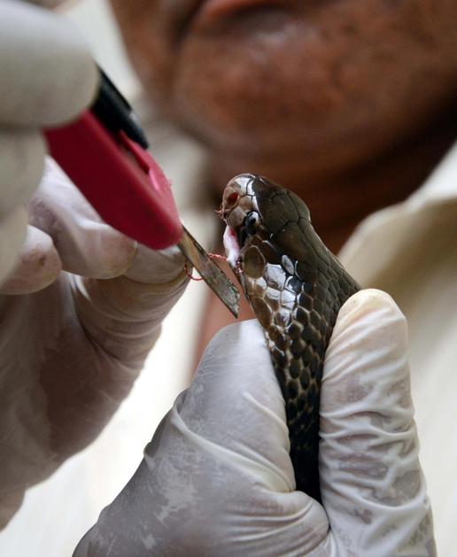 (130813) -- BHOPAL, Aug. 13, 2013 () -- A snake expert cuts the stitches from the mouth of a Cobra snake recovered from the snake charmers in Bhopal, India, Aug. 12, 2013. The snake charmers stitched the mouths of these snakes and injured them as they removed their fangs and venom glands. The forest officials rescue team freed these snakes in the forest and treated them by cutting their stitches. (/Stringer)/DPA/PIXSELL