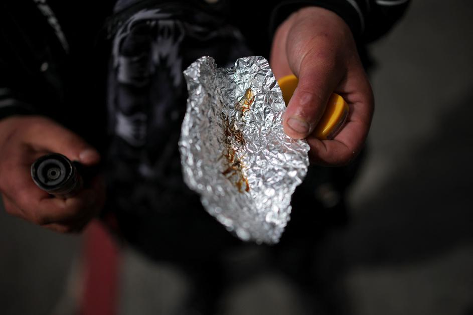 SENSITIVE MATERIAL. THIS IMAGE MAY OFFEND OR DISTURB Rafael, 21, prepares to smoke fentanyl on a street corner in the Tenderloin area of San Francisco, California, U.S. March 26, 2025. REUTERS/Daniel Cole