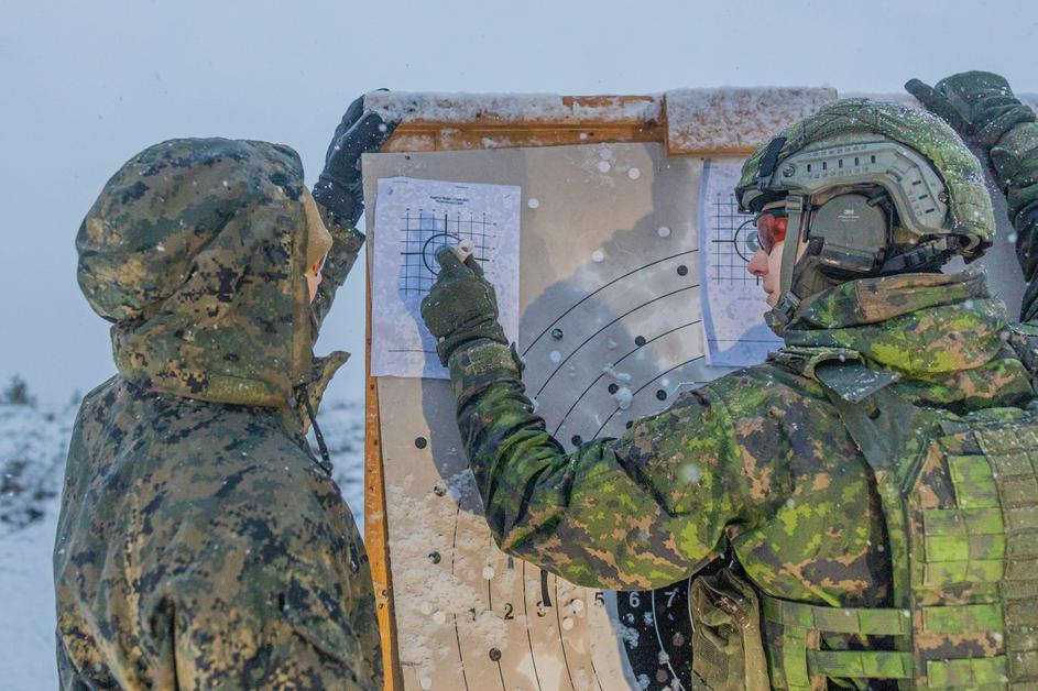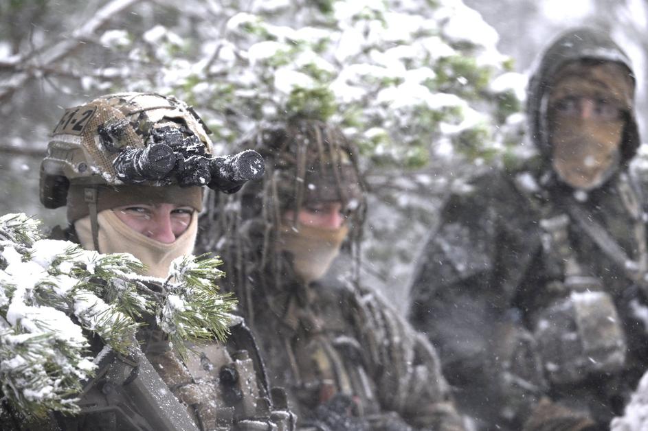 Capt. Andrew Young and 1st Sgt. Dain Cox, assigned to Headquarters and Headquarters Battery, 1st Battalion, 6th Field Artillery Regiment, 41st Field Artillery Brigade familiarize themselves with the terrain around their tactical action center (TAC) during Exercise Joint Viking 25 in Setermoen, Norway, Mar. 02, 2025. The training provided U.S. Soldiers with the skills to operate and maneuver efficiently in an arctic environment. As a multilateral exercise in Norway, Joint Viking 25's goal is to strengthen the U.S. Army's ability to operate with Arctic Allies and rapidly respond to a crisis in Arctic terrain. The exercise involved U.S. Soldiers, Marines and personnel from Norway, the Netherlands, Finland, Germany, Denmark, and Great Britain, focusing on cold weather skills and cooperation with Allied forces. (U.S. Army photo by Capt. Thomas McCarty),Image: 980013836, License: Rights-managed, Restrictions: , Model Release: no