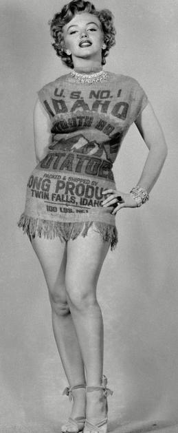 (Archival Classic Cinema - Marilyn Monroe Retrospective) Marilyn Monroe in an Idaho potato sack Mini Dress, circa 1951. Cinema Publishers Collection,Image: 911550455, License: Rights-managed, Restrictions: For Editorial Use Only -, Model Release: no, Pictured: Studio Film and Publicity Stills