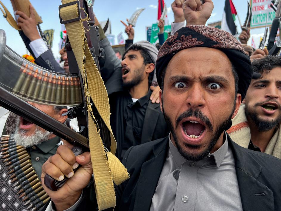 A demonstrator reacts as protesters, mainly Houthi supporters, rally in solidarity with Palestinians, in Sanaa, Yemen May 9, 2025. REUTERS/Adel Al Khader TPX IMAGES OF THE DAY