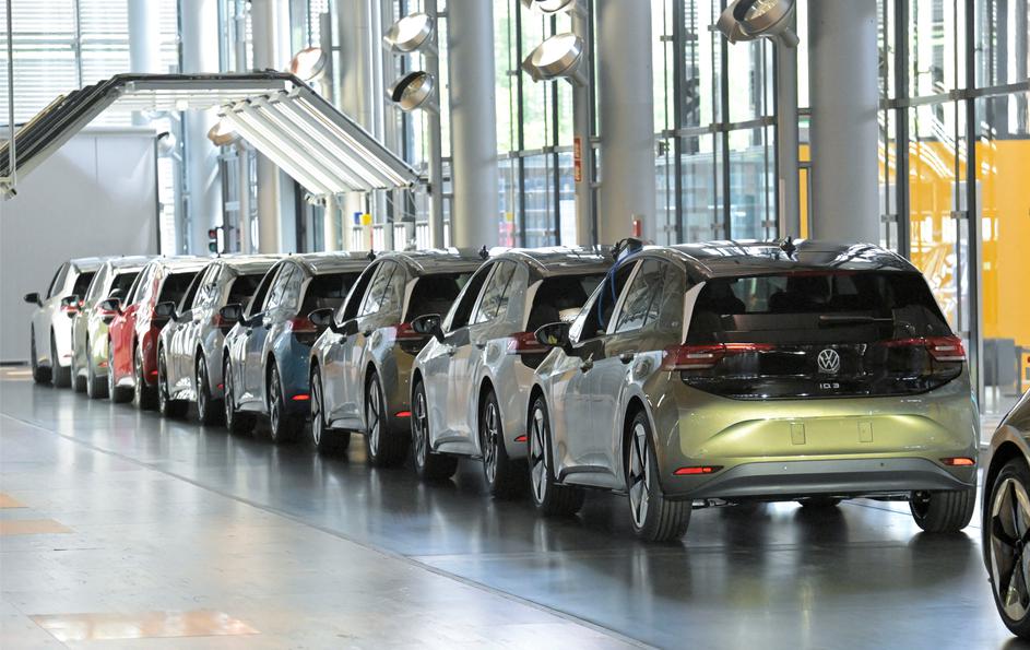 Volkswagen ID.3 cars stand in a queue for the final inspection, during a media tour, in Dresden, Germany, May 14, 2025. REUTERS/Matthias Rietschel