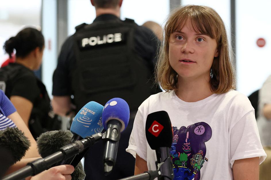 Swedish activist Greta Thunberg, who departed Israel by plane on Tuesday after being detained aboard the Gaza-bound British-flagged yacht "Madleen" after Israeli forces boarded the charity vessel as it attempted to reach the Gaza Strip in defiance of an Israeli naval blockade, talks to journalists surrounded by French police as she arrives at a terminal at the Paris-Charles de Gaulle Airport, in Roissy-en-France near Paris, France, June 10, 2025. REUTERS/Gonzalo Fuentes