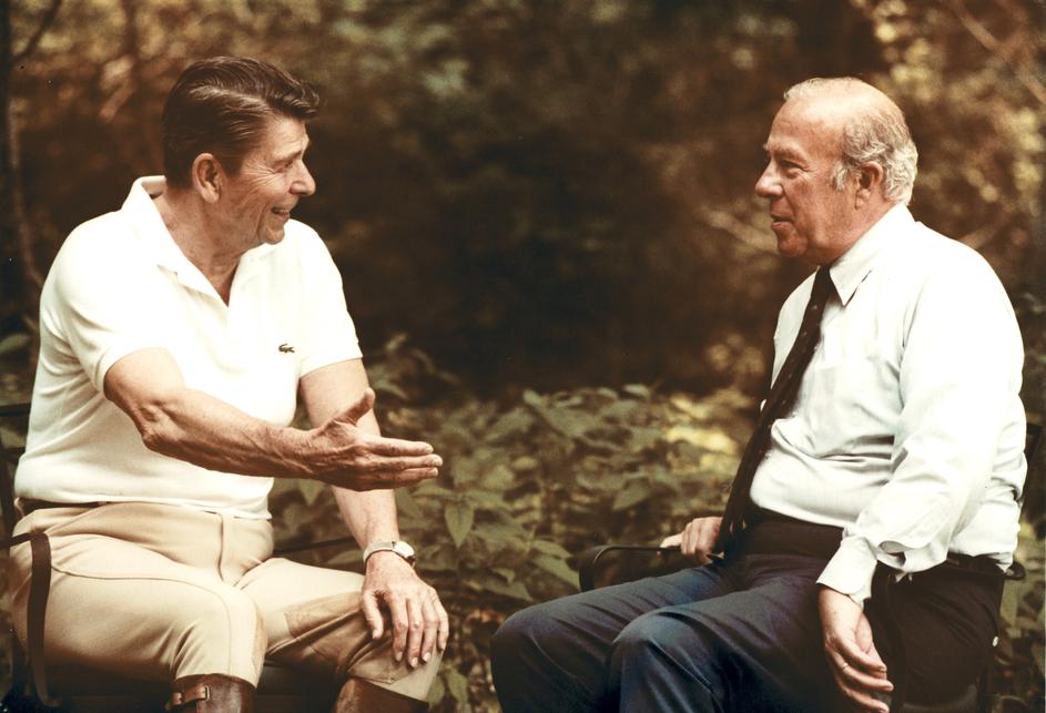 6/26/1982 - Thurmont, Maryland, United States of America: In this photo released by the White House, United States President Ronald Reagan, left, speaks with United States Secretary of State-designate George P. Shultz at Camp David, the presidential retreat near Thurmont, Maryland on Saturday, June 26, 1982. Shultz was named to replace United States Secretary of State Alexander Haig who resigned over policy differences within the Reagan Administration. Mandatory (Michael Evans / White House via CNP,Image: 566128824, License: Rights-managed, Restrictions: , Model Release: no