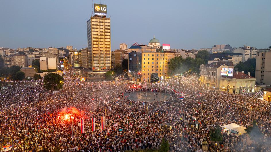 Thousands of people gathered in downtown during a major anti-government rally pressing for an early election after nearly eight months of almost daily anti-corruption demonstrations that have shaken the populist government of President Aleksandar Vucic, in Belgrade, Serbia, Saturday, June 28, 2025.//DAKICSPASA_sipa3536/Credit:Spasa DAKIC/SIPA/2506291304,Image: 1016253846, License: Rights-managed, Restrictions: , Model Release: no