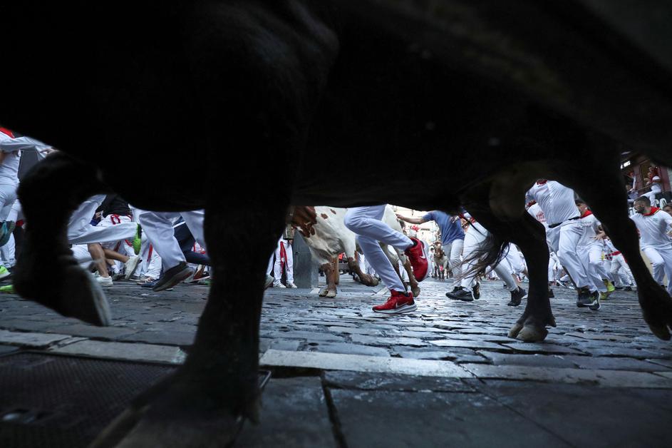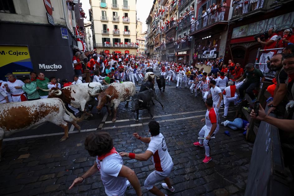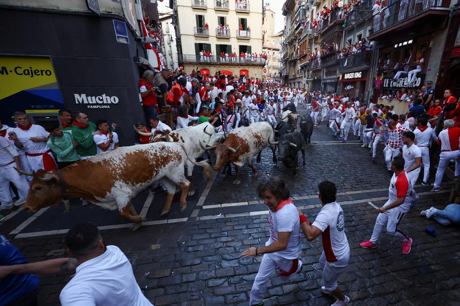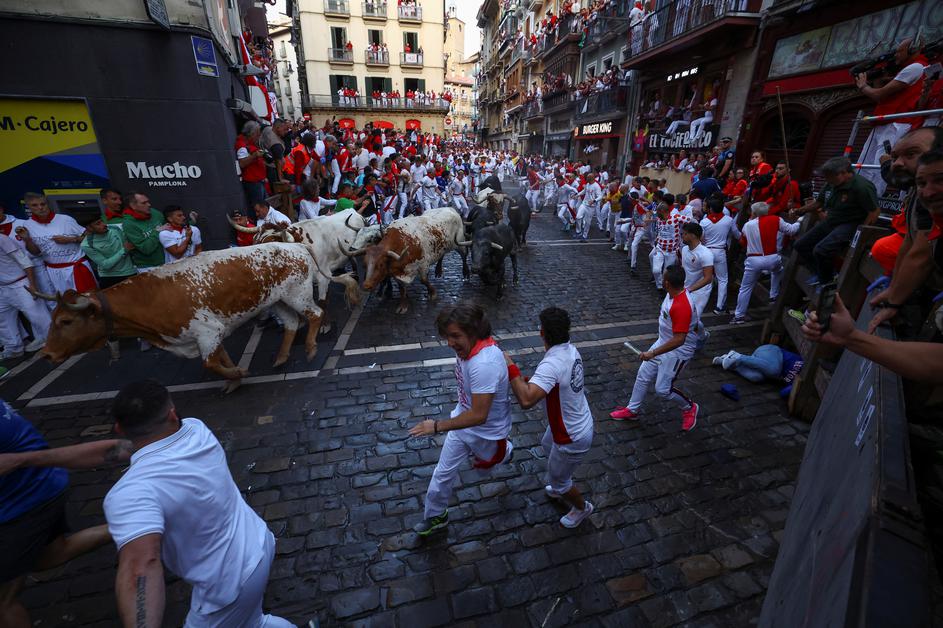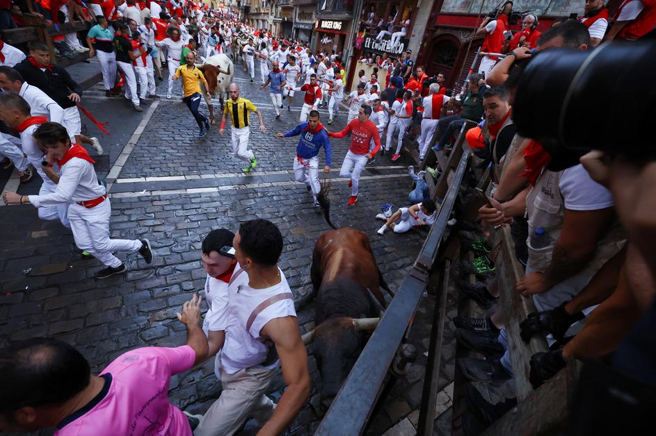 Revellers sprint next to a Cebada Gago fighting bulls during the Encierro (running of the bulls), at the Mercaderes corner, during the San Fermin festival in Pamplona, Spain, July 8, 2025. REUTERS/Albert Gea