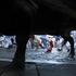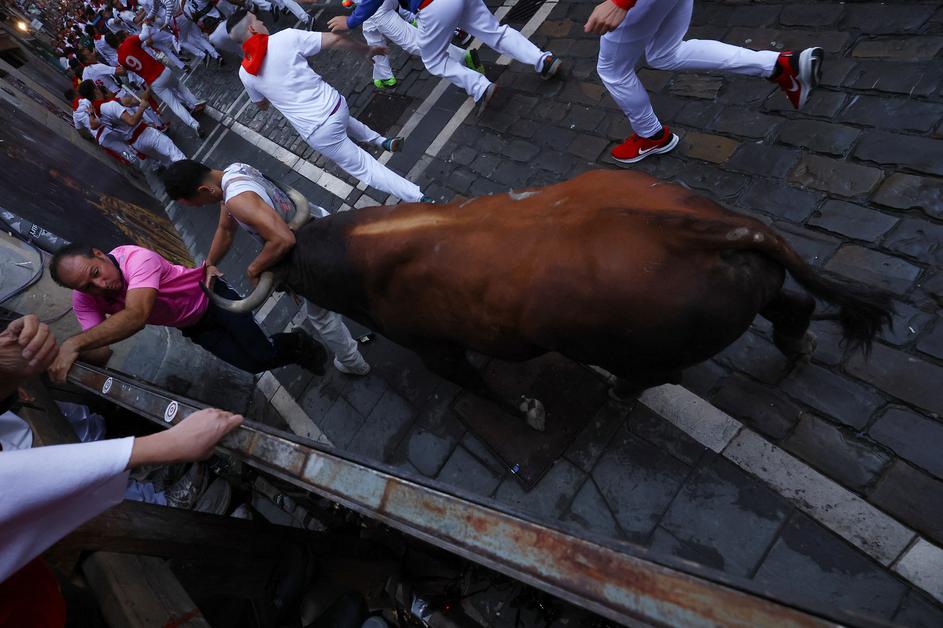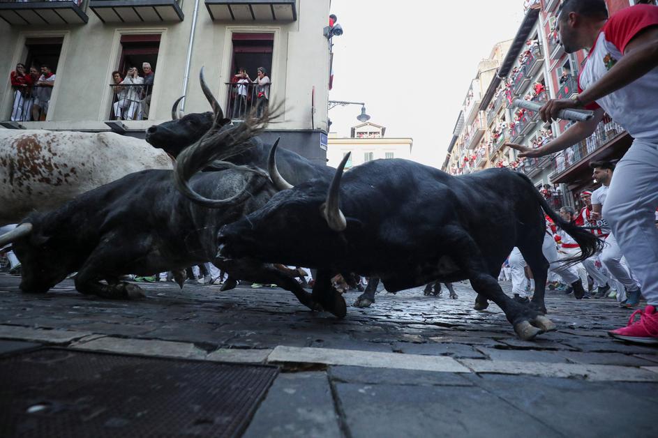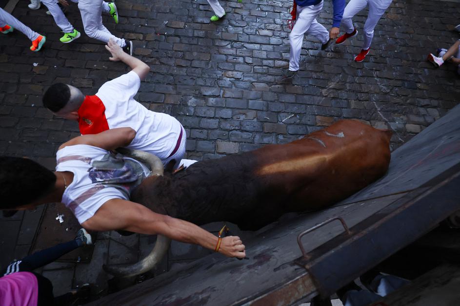 Revellers sprint next to a Cebada Gago fighting bull during the Encierro (running of the bulls), at the Mercaderes corner, during the San Fermin festival in Pamplona, Spain, July 8, 2025. REUTERS/Albert Gea