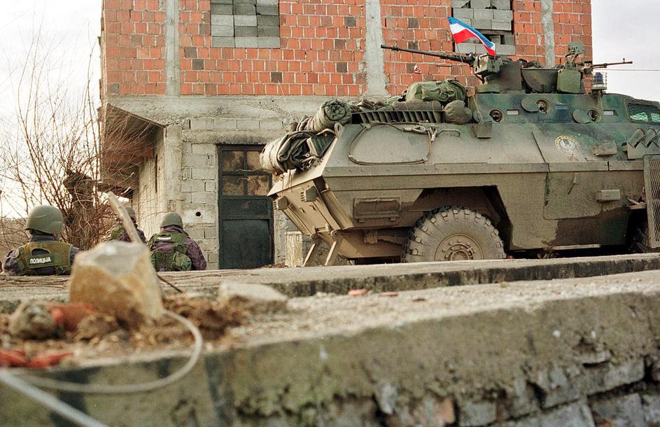 Serb forces stand on alert 21 February in the village of Studencane near Suva Reka, in southern Kosovo, one day after the Kosovo Liberation Army (KLA) retreated from the town after police fired mortars and other weapons. Inhabitants fled the village, taking refuge in nearby communities while the security forces moved on. Studencane, home to 300 to 400 people, is four kilometers from Budakovo village, above which a police helicopter was hit by KLA gunfire 19 February.,Image: 68729013, License: Rights-managed, Restrictions: , Model Release: no