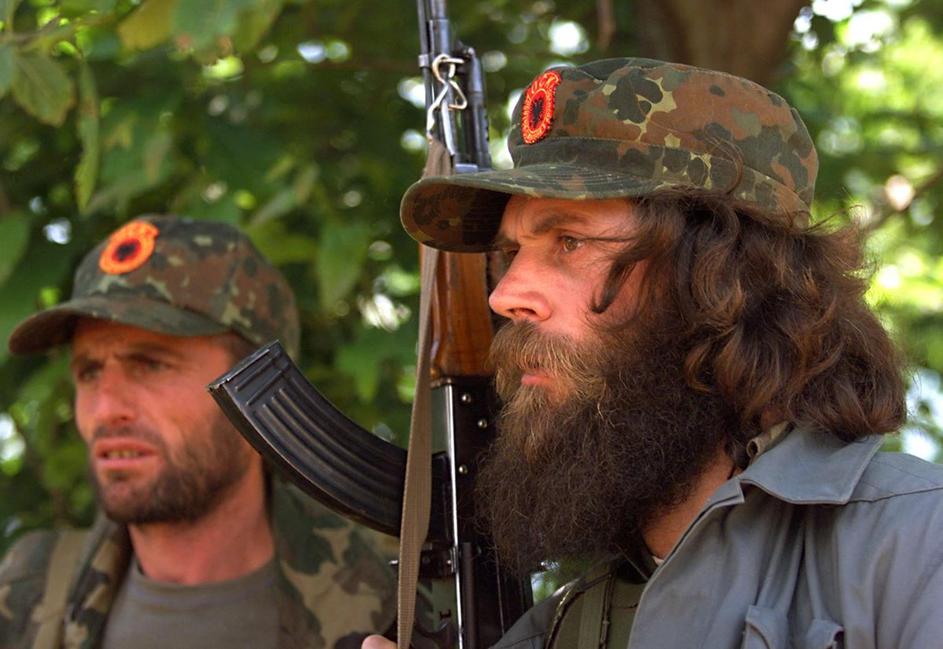 Kosovo Liberation Army (KLA) soldiers make a halt 27 May 1999 in the Tropoje region (Northern Albania) where fightings go on between KLA and the Serb forces. Part of the town has been destroyed by Yugoslav shelling and its inhabitants left. (ELECTRONIC IMAGE),Image: 68762163, License: Rights-managed, Restrictions: , Model Release: no