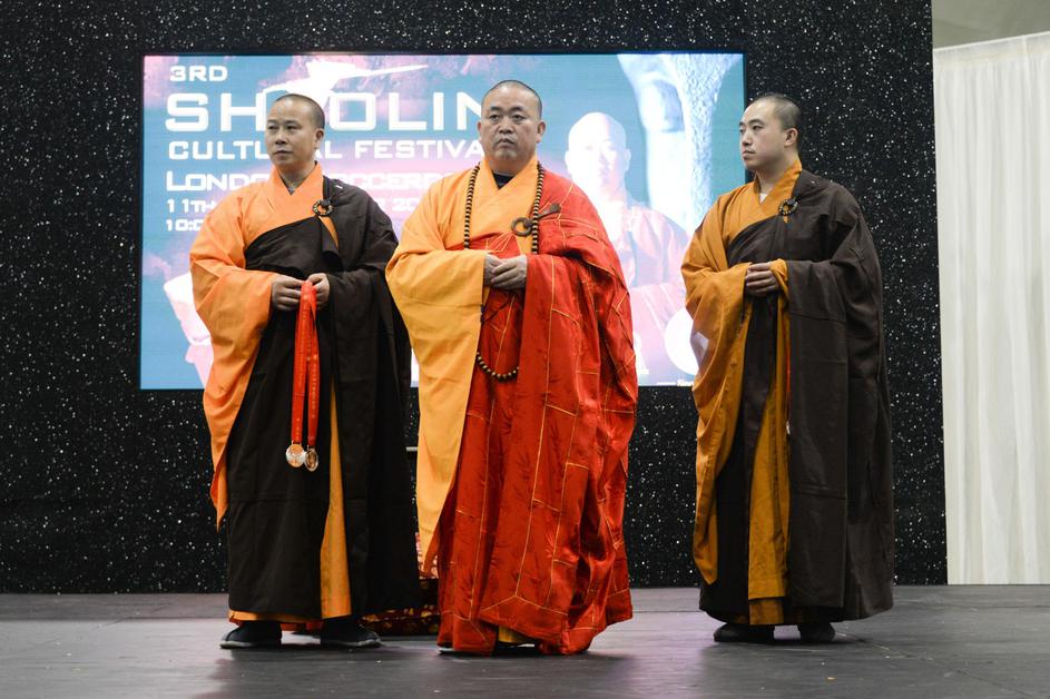 London, UK. 12th October, 2014. Shi Yongxin abbot of the Shaolin Temple awards medalist to students at the 3rd Shaolin Festival at London Soccerdome in London. Credit: See Li/Alamy Live News