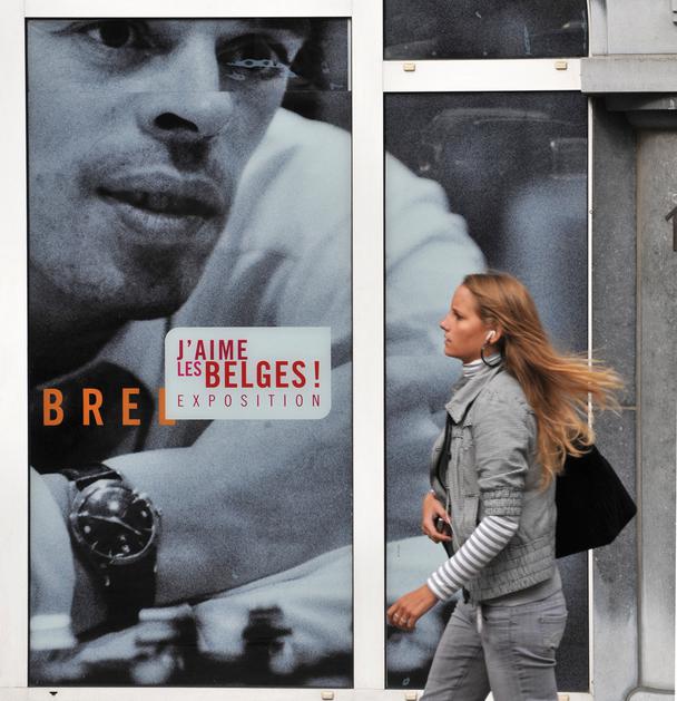 A pedestrian walks past a poster announcing on October 02, 2008 in Brussels the exhibition "J'aime les Belges" ("I love Belgians") about Belgian singer Jacques Brel. The "Flemish" of Brussels, who became famous as a French-speaking singer when he moved to Paris at the age of 24, had until his death on October 9, 1978, a love-hate relation with his native country.,Image: 27424877, License: Rights-managed, Restrictions: TO GO WITH AFP STORY IN FRENCH BY Philippe SIUBERSKI, Model Release: no