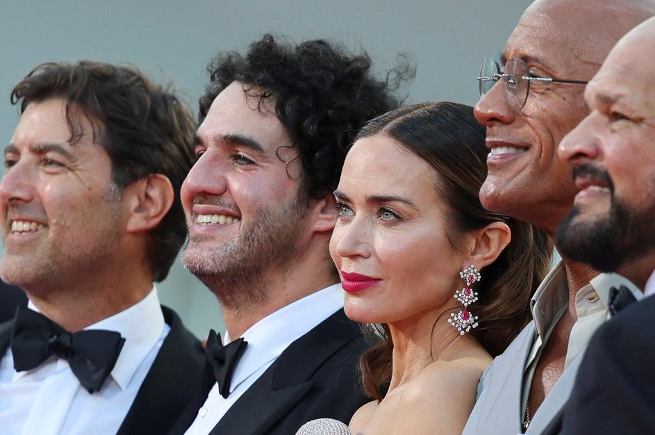 Producer David Koplan, Director Benny Safdie, cast members Dwayne Johnson and Emily Blunt and American former wrestler and mixed martial artist Mark Kerr pose on the red carpet during arrivals for the screening "The Smashing Machine" in competition, at the 82nd Venice Film Festival, Venice, Italy, September 1, 2025. REUTERS/Yara Nardi Photo: YARA NARDI/REUTERS