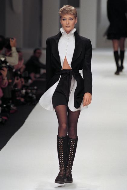 Italian-French model Carla Bruni displays a black and white creation designed by Claude Montana on October 12, 1993 during the the Spring/Summer 94 ready-to-wear collection in Paris.,Image: 816278248, License: Rights-managed, Restrictions: , Model Release: no