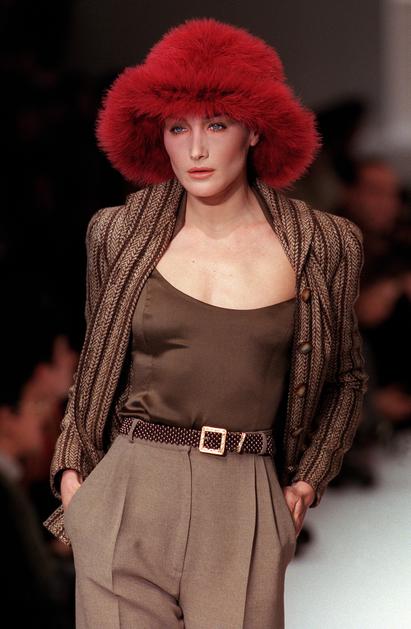 French model of Italian origins Carla Bruni wears an outfit from Valentino Boutique, on March 17, 1996, during the 1996/97 fall-winter ready-to-wear fashion show in Paris. AFP PHOTO PIERRE VERDY,Image: 68495989, License: Rights-managed, Restrictions: , Model Release: no
