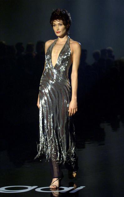 I03 - 20000220 - MILAN, ITALY : Italian top model Carla Bruni presents a long dress by Gai Mattiolo during the ready-to-wear women's fashion show in Milan, 20 February 2000. PHOTO ANSA/GIUSEPPE FARINACCI/to-cl - celá stříbrná šaty třásně výstřih,Image: 670610974, License: Rights-managed, Restrictions: , Model Release: no
