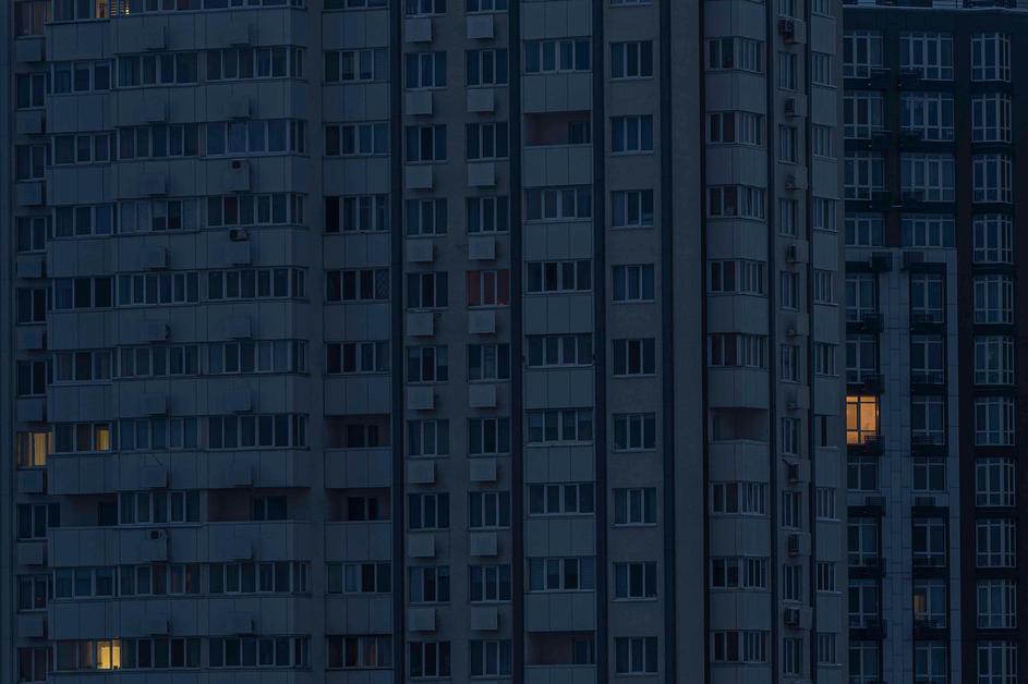 Kyiv, 22/11/2024, High-rise buildings seen without power during scheduled blackout in Kyiv. Residents experiences multiple blackouts per day, as Russia has destroyed big parts of Ukraine’s energy infrastructure. While businesses rely mostly on diesel powe