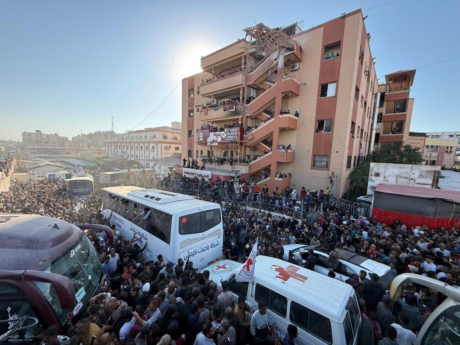 Palestinians released by Israel under the first phase of the ceasefire agreement arrive at Nasser Hospital