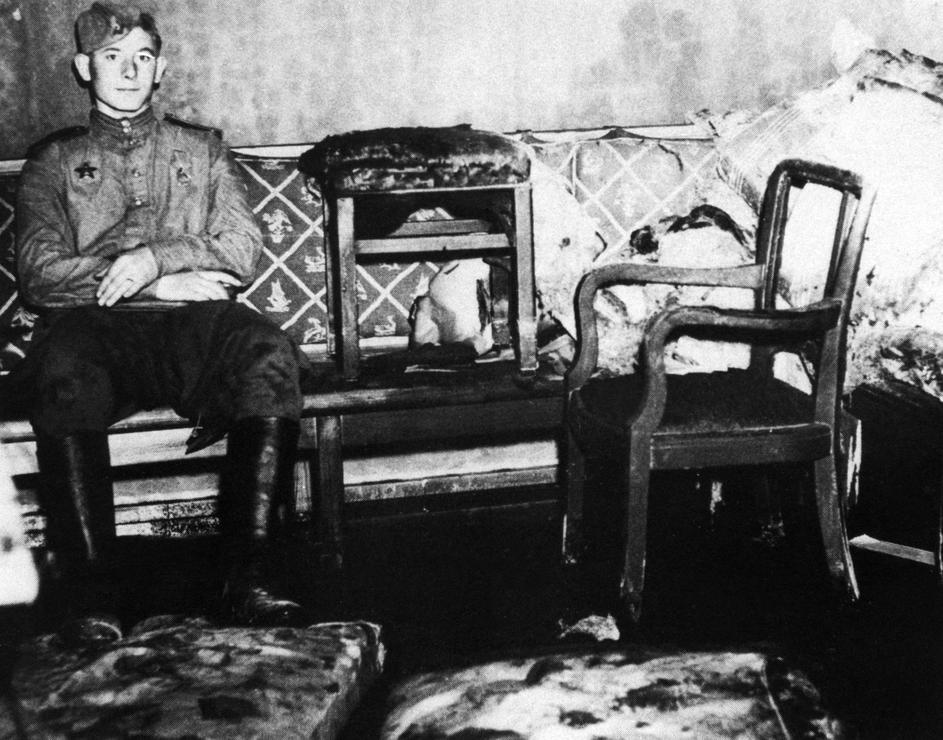 Soviet soldier in the "Fuehrerbunker" (Fuehrer's bunker) in Berlin, 1945
