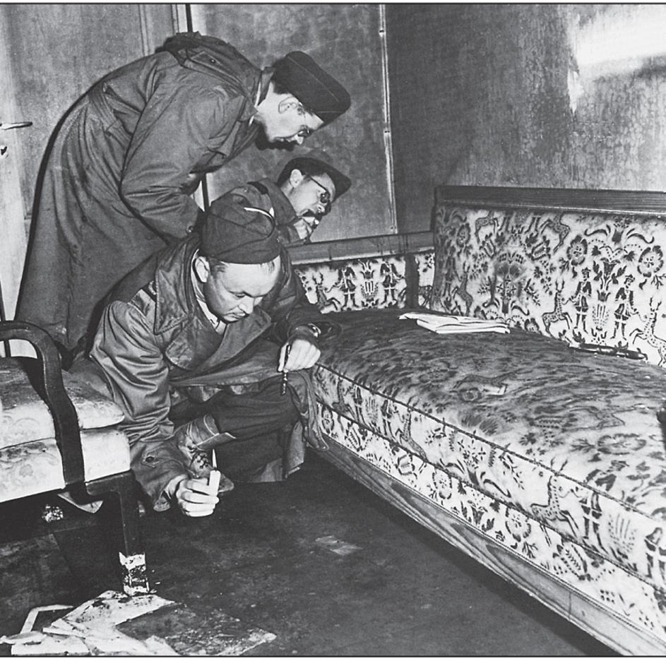 Hitler, Adolf, 20.4.1889 - 30.4.1945, German politician (NSDAP), Fuehrer and Reich Chancellor 1933 - 1945, Fuehrerbunker Berlin, sofa, US soldiers looking for blood stains, 1945,