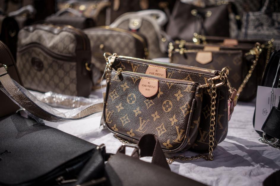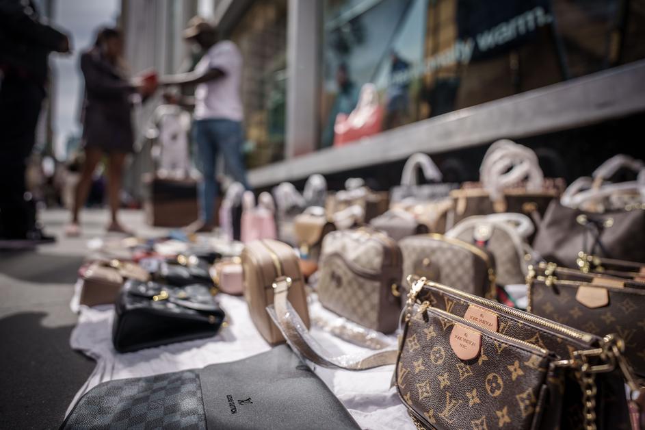 16 September 2023, USA, New York: Fake Louis Vuitton handbags are on sale on 5th Avenue in Manhattan. Photo: Michael Kappeler/dpa Photo: Michael Kappeler/DPA