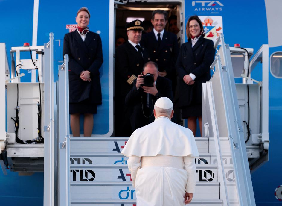 Members of the crew look on as Pope Leo XIV boards the papal plane ahead of his first apostolic journey to Turkey and Lebanon, at Fiumicino Airport, near Rome, Italy, November 27, 2025. REUTERS/Remo Casilli