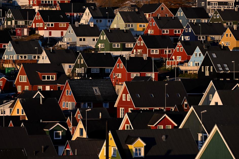 A view shows traditional Greenlandic houses illuminated by a beam of sunlight during sunset in Nuuk, Greenland, on September 23, 2025.,Image: 1039847740, License: Rights-managed, Restrictions: , Model Release: no