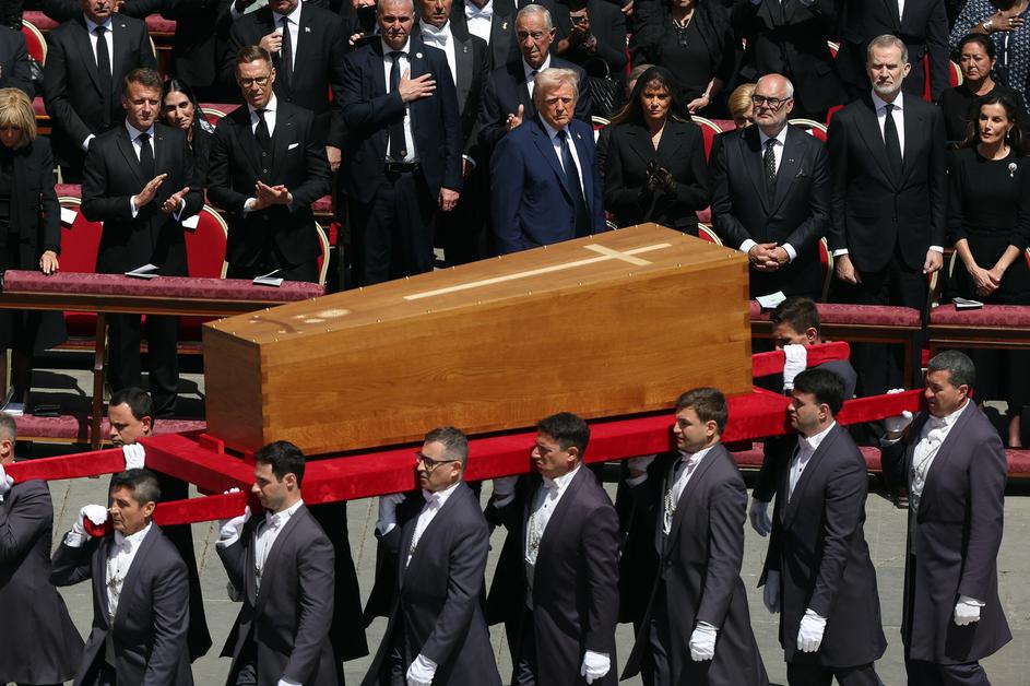 Emanuelle Macron, Alexander Stubb, Donald Trump, Melania, King of Spain Felipe and wife Letizia salute the coffin and leave the square. World leaders attend Pope Francis' funeral in front of St. Peter's Basilica in Rome. Cardinal Giovanni Battista Re celebrates the funeral mass of Pope Francis Bergoglio on the steps of St. Peter's Basilica in Rome in front of 200,000 faithful and state leaders from around the world.,Image: 993053325, License: Rights-managed, Restrictions: *** World Rights ***, Model Release: no