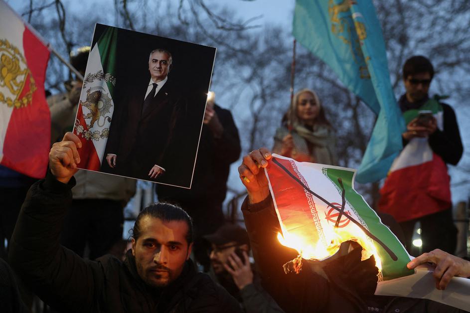 A man displays an image of Reza Pahlavi, the exiled son of the last Shah of Iran, as demonstrators gather outside the Iranian embassy during a rally in support of nationwide protests in Iran, in London, Britain, January 11, 2026. REUTERS/Isabel Infantes