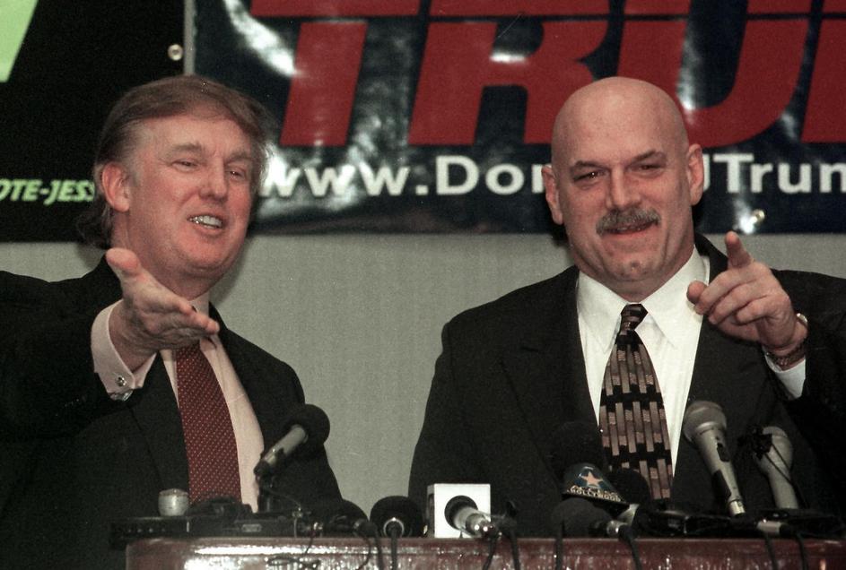 New York developer and potential Reform Party presidential candidate Donald Trump (L) and Minnesota Govenor Jesse Ventura (R) take questions at a news conference after Trump gave a speech at a Chamber of Commerce luncheon 07 January 2000 in Brooklyn Park, Minnesota, the city where Ventura was once mayor. Trump will also speak at a fund-raiser for the Jesse Ventura Volunteer Committee in Brooklyn Park.,Image: 20460039, License: Rights-managed, Restrictions: , Model Release: no