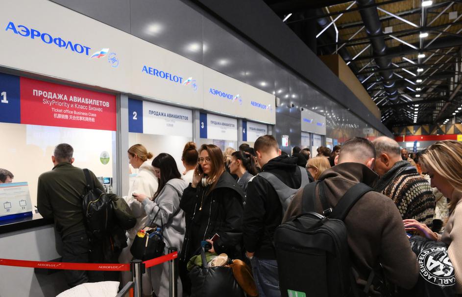 9093542 26.01.2026 Passengers gather by an Aeroflot ticket office at the Sheremetyevo International Airport outside Moscow, Russia. Russian national flag carrier Aeroflot has warned of some possible flight cancellations after nationwide booking system outage on January 26.,Image: 1069534584, License: Rights-managed, Restrictions: Editors' note: THIS IMAGE IS PROVIDED BY RUSSIAN STATE-OWNED AGENCY SPUTNIK., Model Release: no