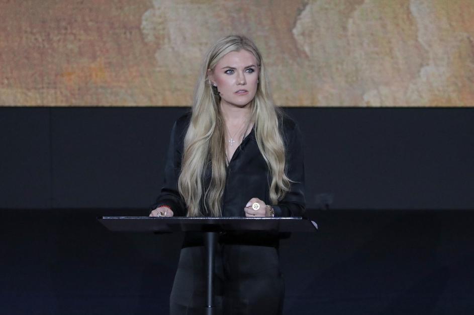 RIVERSIDE, CALIFORNIA - JANUARY 21: Erika Kirk, widow of Charlie Kirk, speaks to attendees at the 'Make Heaven Crowded Tour' in Riverside, California on January 21, 2026. Grace Hie Yoon / Anadolu/ABACAPRESS.COM,Image: 1068244379, License: Rights-managed, Restrictions: , Model Release: no