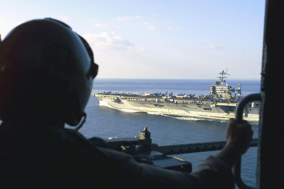 An aircrewman from Anti-Submarine Helicopter Squadron SEVEN (HS-7) looks on as USS HARRY S. TRUMAN (CVN 75) transits through the Straights of Hormuz. Truman is enroute to the Persian Gulf in support of Operation SOUTHERN WATCH. Subject Operation/Series: S