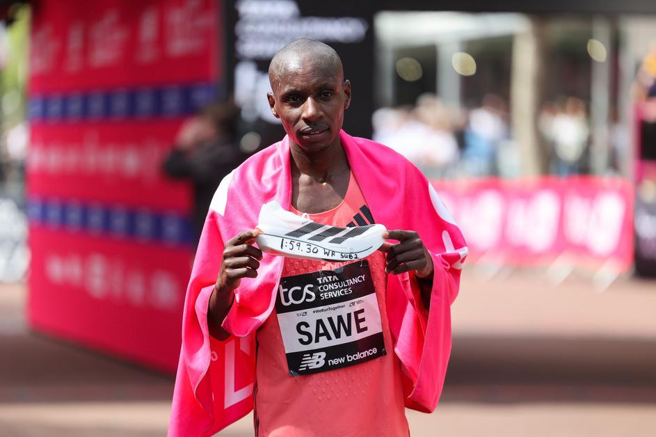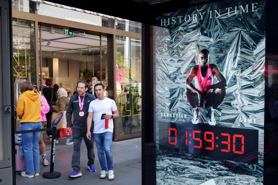 The morning after Kenyan runner Sabastian Sawe won the London Marathon with a world record time of 1:59.30, the first-ever sub-two-hour marathon in a competitive race, an ad for his historic achievement is displayed outside the New Balance store in London