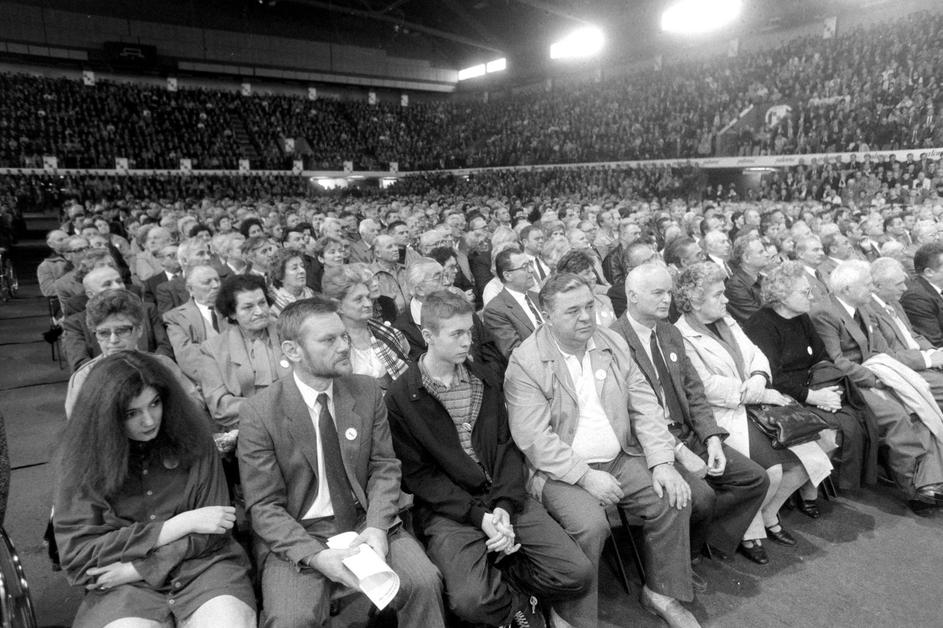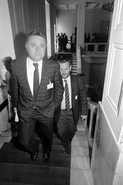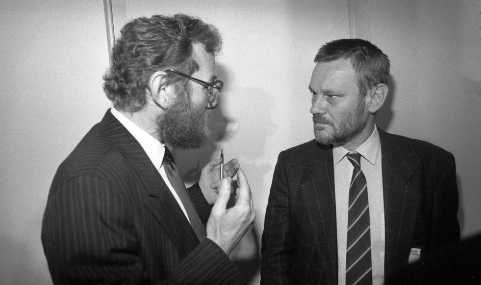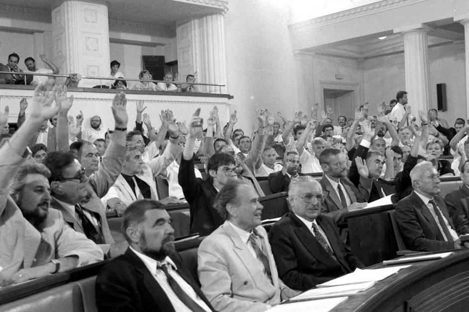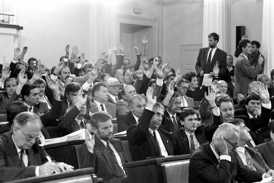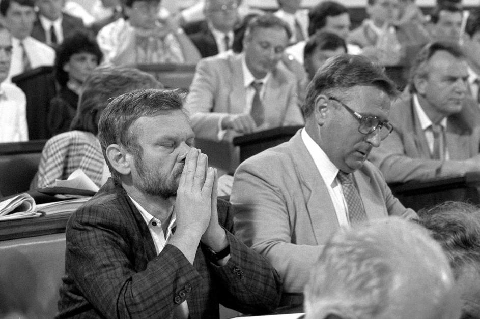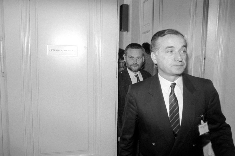 30.5.1990. Zagreb - Prvi saziv Sabora Republike Hrvatske konstituiran je 30. svibnja 1990. u Zagrebu nakon prvih višestranačkih izbora održanih u travnju i svibnju. Za predsjednika Sabora izabran je dr. Žarko Domljan, a za predsjednika Izvršnog vijeća Stjepan Mesić. Izabrana su tri potpredsjednika Sabora, a četvrto mjesto je upražnjeno jer je Srpska demokratska stranka, čiji zastupnici nisu prisustvovali konstituiranju Sabora, brzojavom otklonila kandidaturu svog predstavnika. Za potpredsjednike su izabrani Ivica Percan, Stjepan Sulimanec i Vladimir Šeks, a za tajnika Sabora Velibor Kikerec Ivica Racan Photo: Josip Bistrovic/HISTORY JB/PIXSELL