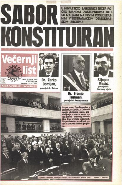 30.5.1990. Zagreb - Prvi saziv Sabora Republike Hrvatske konstituiran je 30. svibnja 1990. u Zagrebu nakon prvih višestranačkih izbora održanih u travnju i svibnju. Za predsjednika Sabora izabran je dr. Žarko Domljan, a za predsjednika Izvršnog vijeća Stjepan Mesić. Izabrana su tri potpredsjednika Sabora, a četvrto mjesto je upražnjeno jer je Srpska demokratska stranka, čiji zastupnici nisu prisustvovali konstituiranju Sabora, brzojavom otklonila kandidaturu svog predstavnika. Za potpredsjednike su izabrani Ivica Percan, Stjepan Sulimanec i Vladimir Šeks, a za tajnika Sabora Velibor Kikerec Zeljko Rohatinski, Stjepan Zdunic, Vlatko Pavletic, Stjepan Mesic, Milan Ramljak, Drazen Kalogjera i Osman Muftic Ivica Racan Photo: Josip Bistrovic/PIXSELL