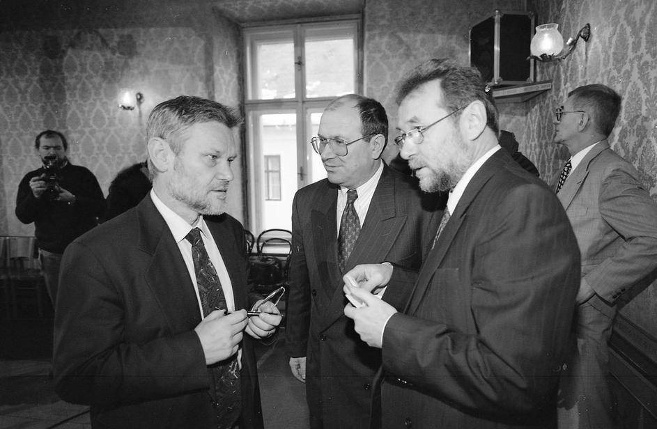30.5.1990. Zagreb - Prvi saziv Sabora Republike Hrvatske konstituiran je 30. svibnja 1990. u Zagrebu nakon prvih višestranačkih izbora održanih u travnju i svibnju. Za predsjednika Sabora izabran je dr. Žarko Domljan, a za predsjednika Izvršnog vijeća Stjepan Mesić. Izabrana su tri potpredsjednika Sabora, a četvrto mjesto je upražnjeno jer je Srpska demokratska stranka, čiji zastupnici nisu prisustvovali konstituiranju Sabora, brzojavom otklonila kandidaturu svog predstavnika. Za potpredsjednike su izabrani Ivica Percan, Stjepan Sulimanec i Vladimir Šeks, a za tajnika Sabora Velibor Kikerec Zarko Domljan, Vladimir Seks i Ivica Racan Photo: Josip Bistrovic/HISTORY JB/PIXSELL