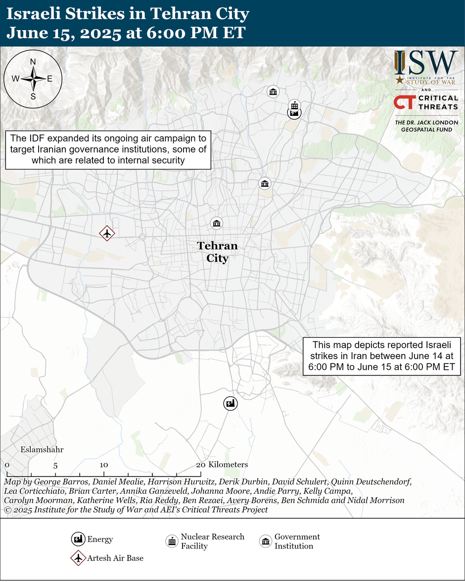 IDF je izveo najistočniji udar do sada, pogodivši zračnu bazu iranske regularne vojske (Artesh) u blizini Mashhada, u pokrajini Khorasan Razavi na sjeveroistoku Irana. Većina prethodnih izraelskih udara bila je usmjerena na protuzračne sustave u zapadnom i središnjem Iranu. Napadi imaju za cilj: uspostavu zračne nadmoći nad Iranom, smanjenje sposobnosti režima da kontrolira unutarnje nemire i paralizu ključne infrastrukture (energija, sigurnost, komunikacije), objavio je Institut za proučavanje rata. Traju i napadi na iransku prijestolnicu. Tako je CNN geolocirao snimke dima u blizini Ministarstva pravosuđa u zapadnom Teheranu.